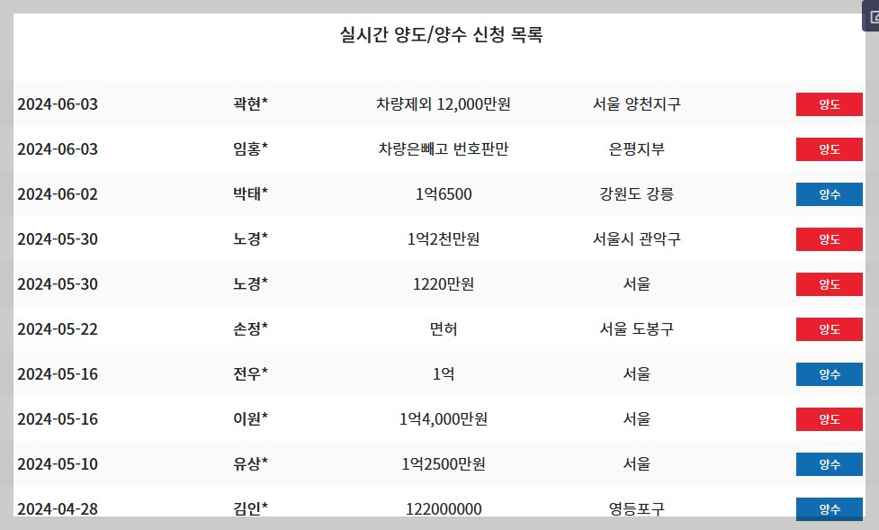3. 실시간 시세와 지역별로 양수, 양도 신청 목록도 확인할 수 있습니다.